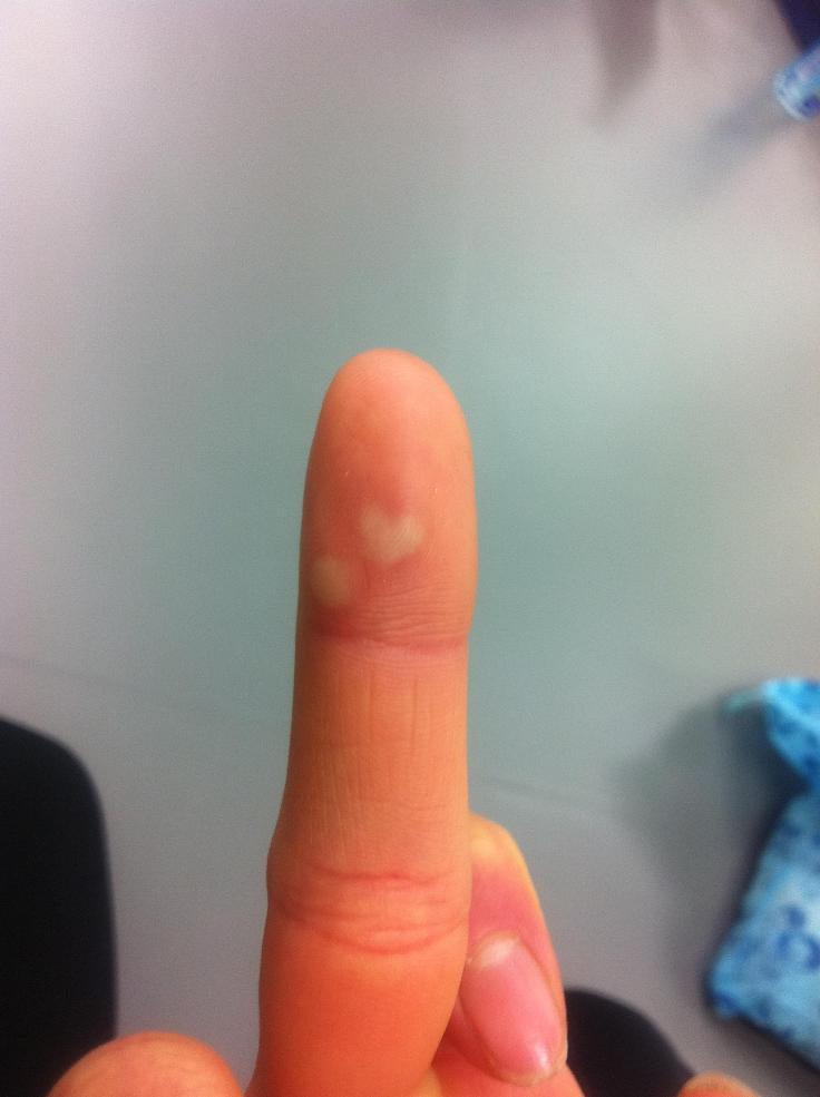 稽古の途中、小道具の準備してる時に突然、「火傷がハートになってるぅ~。かわいい~❤」とまなみん。キッチンお掃除中に火傷したらしい。で、見てみたら・・・