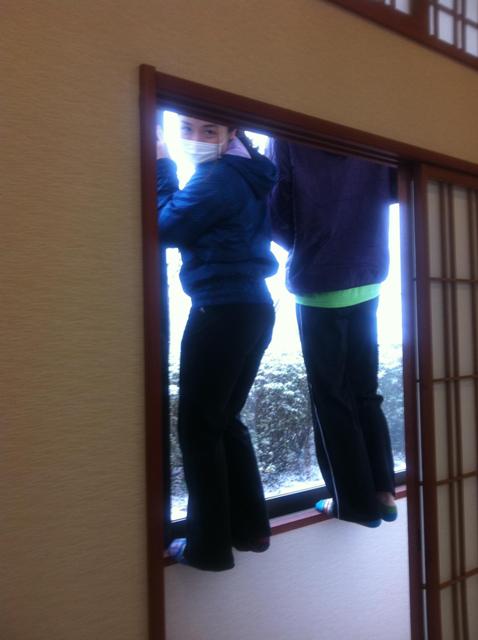 リハーサル終了後、休憩中に外を見ると、なんと雪が!!朝は晴れてたのに、山の天気は変わりやすいのね~。真っ白だよ~、けっこう降ってるね~。