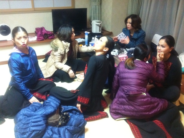 衣装に着替えて、舞台裏へ。なぜか暖房が効かず、寒い・・・コート着用!