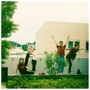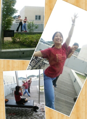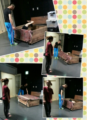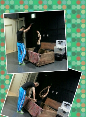 劇場に入って、それぞれがストレッチをしようと、よい場所を探していると…あ!!
